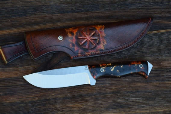 Prezentowany egzemplarz posiada na rękojeści drewno stabilizowane podklejone czarnym G10 oraz piękne piny mozaikowe.